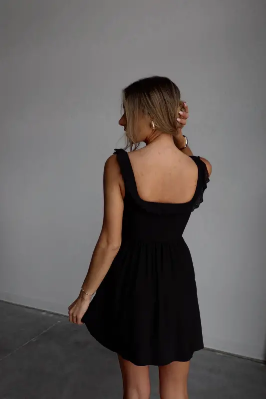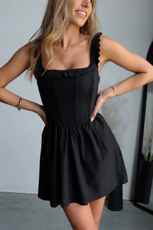 This enchanting dress features delicate eyelet detailing and charming ruffle accents, exuding a timeless and feminine appeal. The corset-style bodice provides a flattering fit, while the babydoll silhouette ensures comfort and ease of movement. Made with stretch cotton fabric, this mini dress offers both style and flexibility, making it perfect for any occasion.