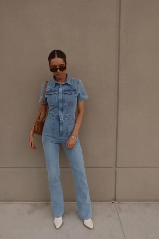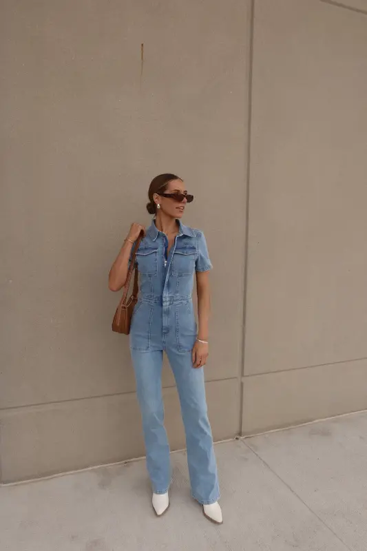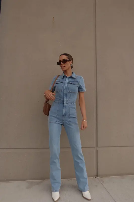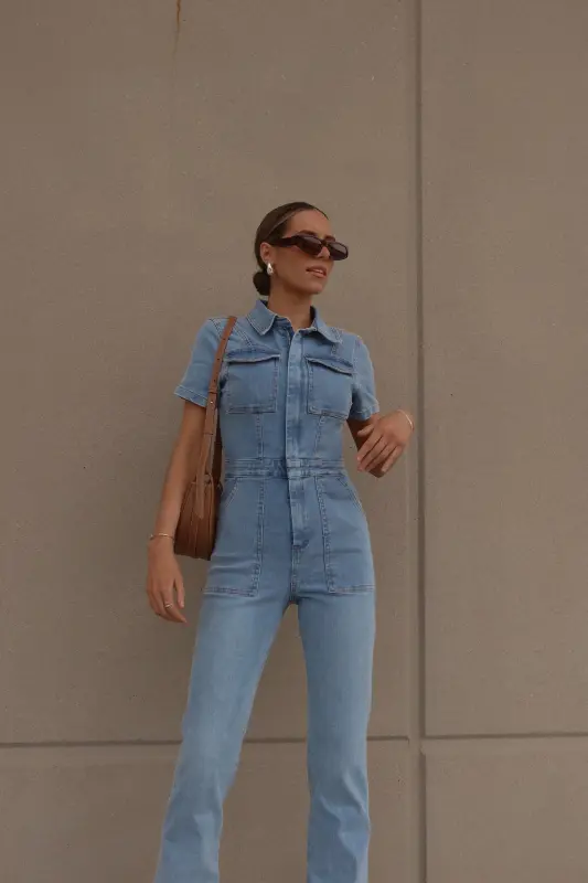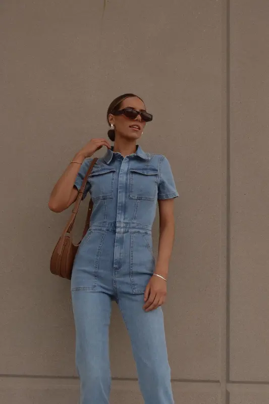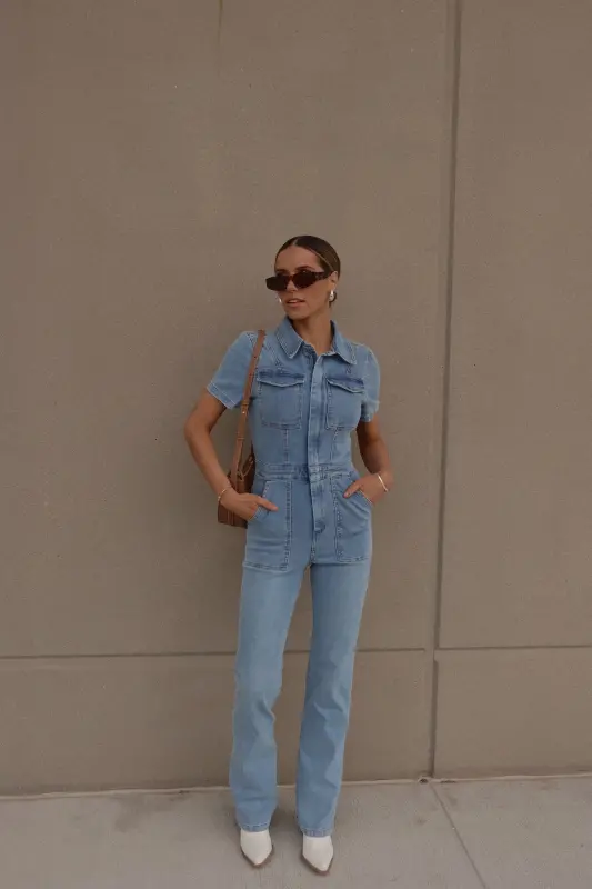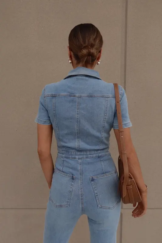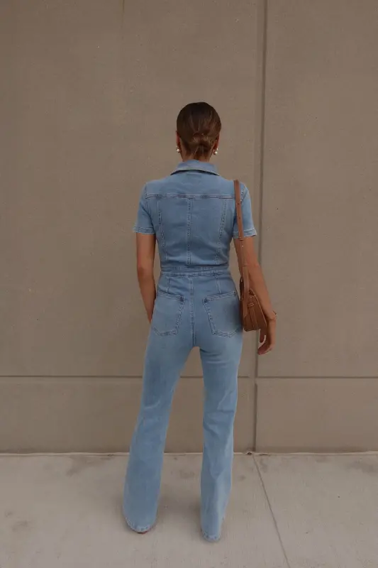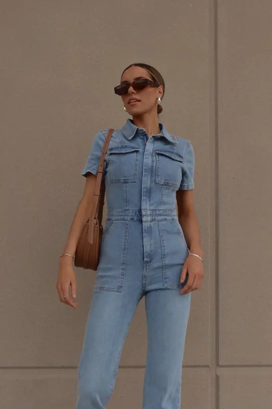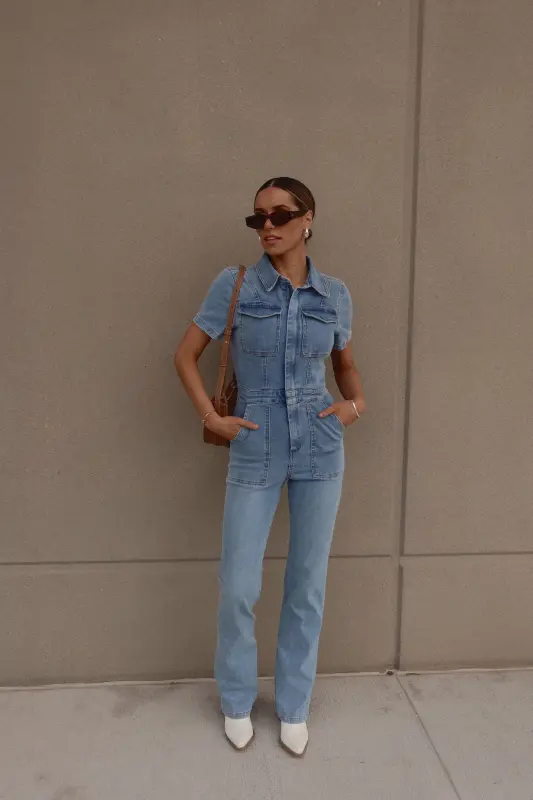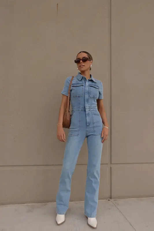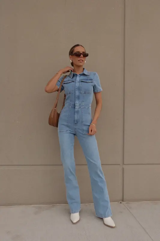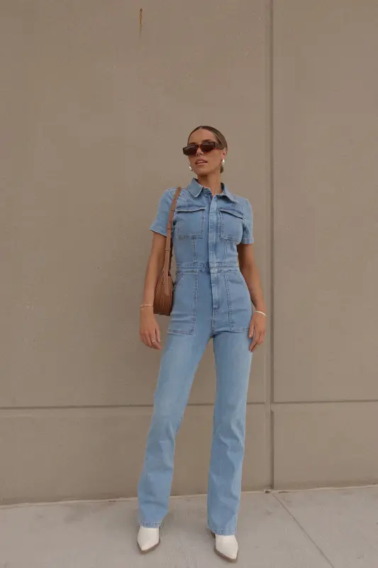 Introducing our Chelsey Denim Jumpsuit, a versatile and stylish addition to your wardrobe. Crafted from authentic denim, this short-sleeve jumpsuit features a classic collared neckline and a convenient zip closure down the bodice for easy wear. Designed with a flattering flare leg fit, it boasts cargo pocket detailing throughout and an emphasized waistline for a chic silhouette. Complete with functional belt loops on the pronounced waistline and two pockets on the bust, along with two back pockets on the back, this jumpsuit combines fashion with functionality. With a hint of stretch throughout, it offers a comfortable fit that runs true to size.