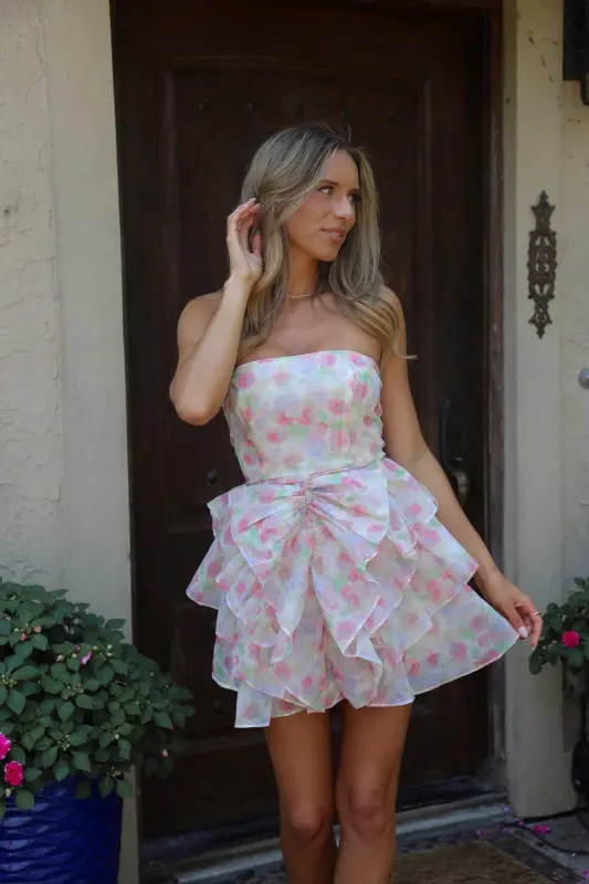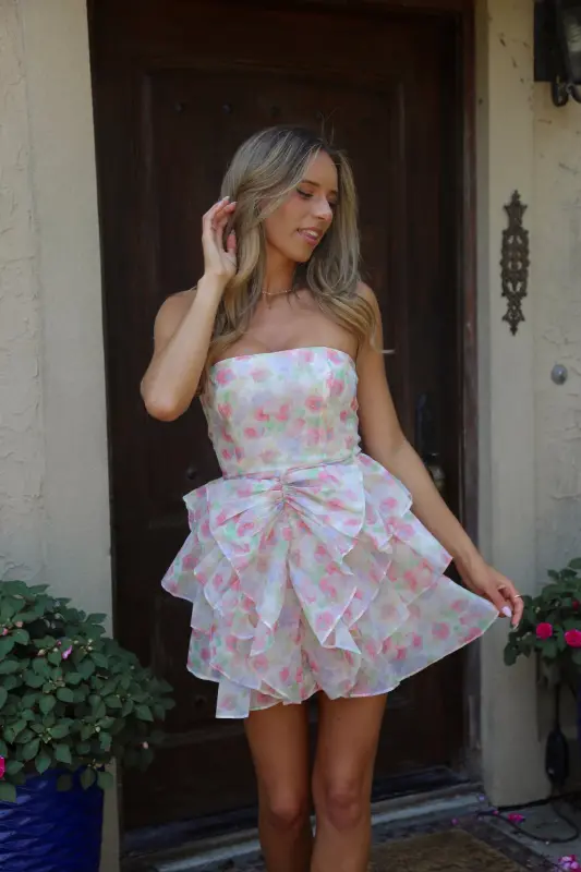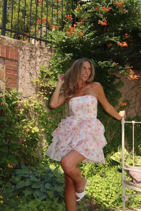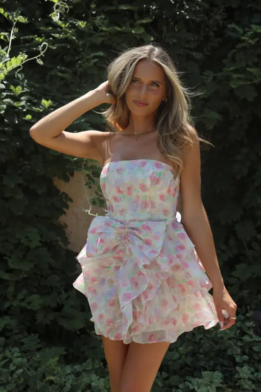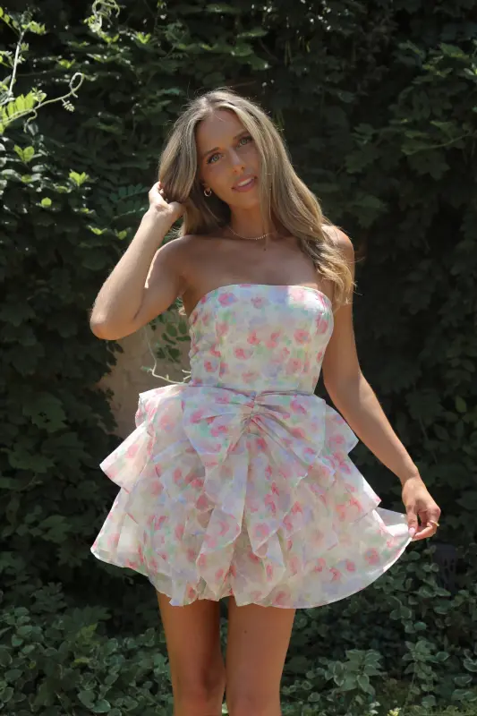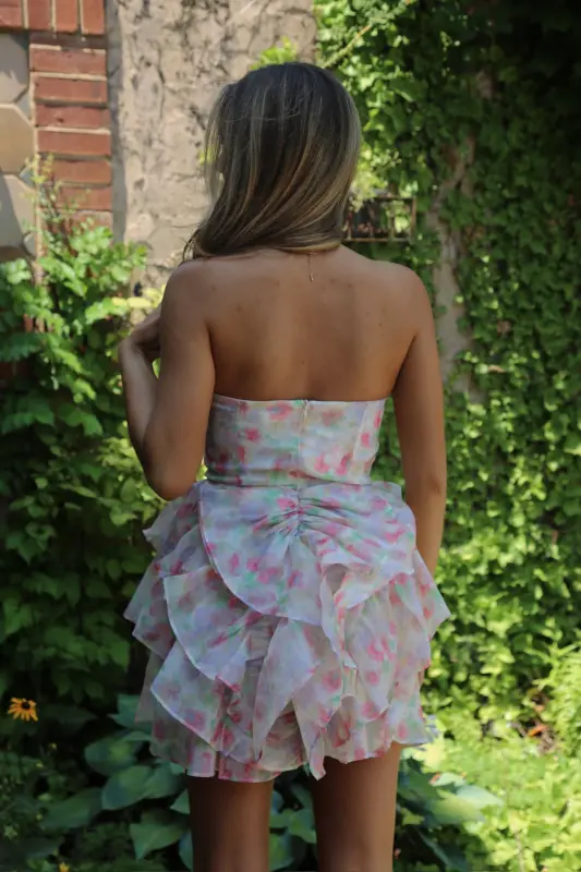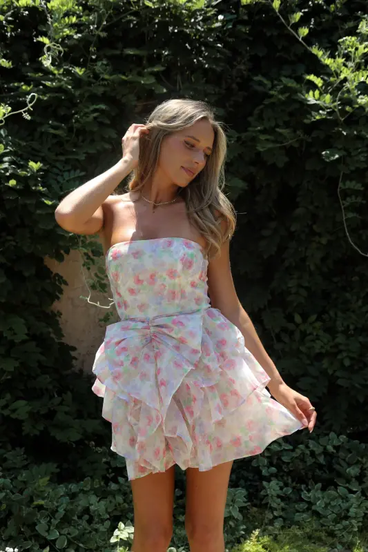Indulge in the sweet and sophisticated Erin Multi-Floral Ruffled Mini Dress. The strapless design with a subtle bow detail and ruffled skirt exudes an elevated and chic vibe. The sheer floral mesh overlay adds a touch of daintiness, while the soft inner lining ensures comfort. Perfect for spring and summer garden parties, this mini dress is the epitome of class. Features a zipper closure for an effortless fit.