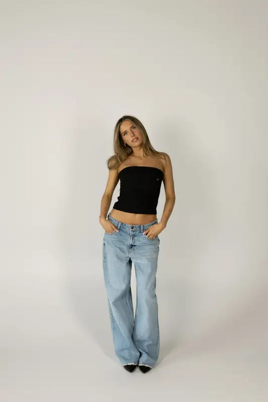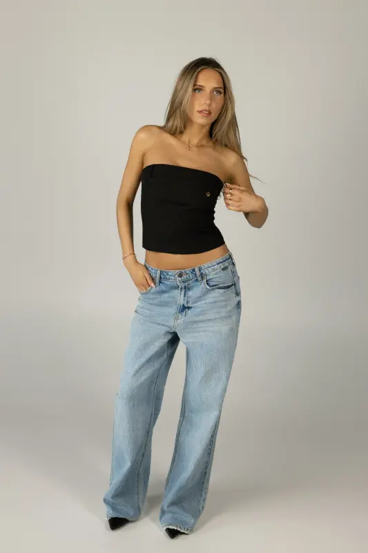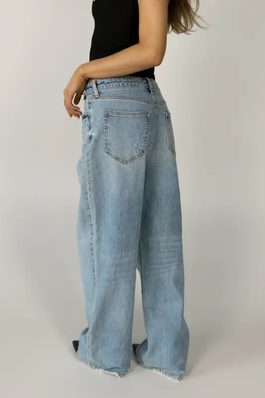 Our Jayde Wide Leg Denim is a light wash denim. These jeans feature a baggy, low waisted, wide leg denim with a distressed hem. These jeans have a 12 1/4" rise, 32" inseam. These jeans feature functional pockets, low waistline with button and zipper closure, and wide hemline. These jeans are non-stretch and provide a figure flattering fit.
