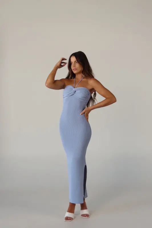 Expertly crafted for a sleek and elegant look, our Mila Halter Knit Midi Dress features a flattering halter neck and ruched detail. Made from a knit fabric, this dress hugs and contours your curves while the long slit adds a touch of allure. This dress does not have a zipper closure; you slip it on, making it both stylish and easy to wear.