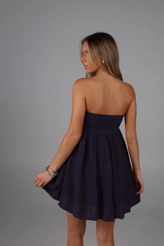 Perfect for warm weather, this navy mini dress is made from lightweight textured material, ensuring comfort without compromising on style. Fully lined for a smooth fit, it drapes elegantly and moves gracefully with every step.