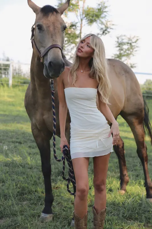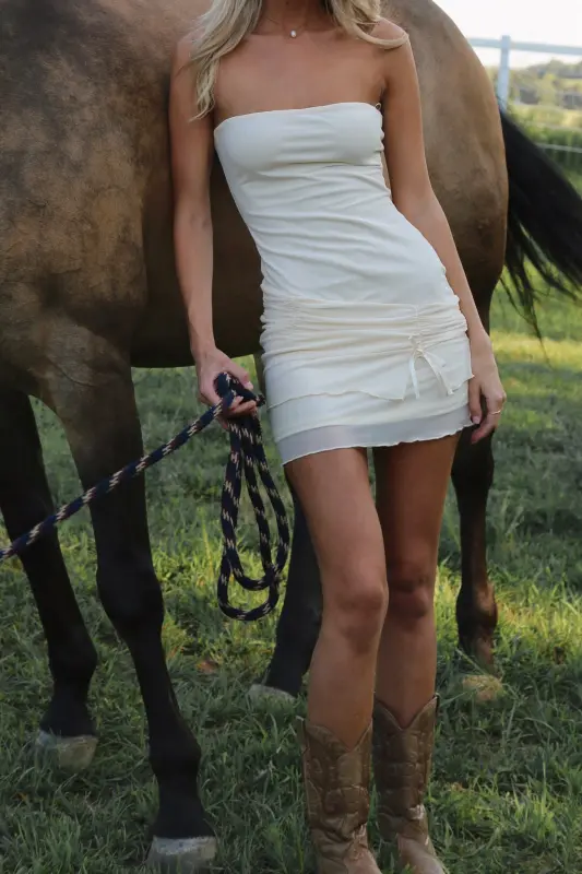 Turn up the charm with our Mesh Bodycon Mini Dress with Ribbon. This stunning strapless dress features double-lined fabric for a secure fit and added comfort. The ruching detail at the lower bodice enhances your curves, creating a flattering silhouette. Made from 95% nylon and 5% spandex, this dress offers the perfect blend of stretch and durability. Perfect for any special occasion, this dress will ensure you stand out and feel fabulous all night long.