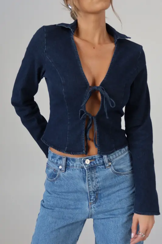 The Stretch Denim Tie-Front Collared Top is the perfect mix of casual and chic. This cropped long-sleeve top features adjustable front ties, allowing you to create a customized fit that flatters your silhouette. The classic collar detail adds a touch of sophistication, while the stretch denim fabric ensures both comfort and style. Ideal for pairing with high-waisted jeans or skirts, this top is a versatile addition to your wardrobe that transitions effortlessly from day to night.