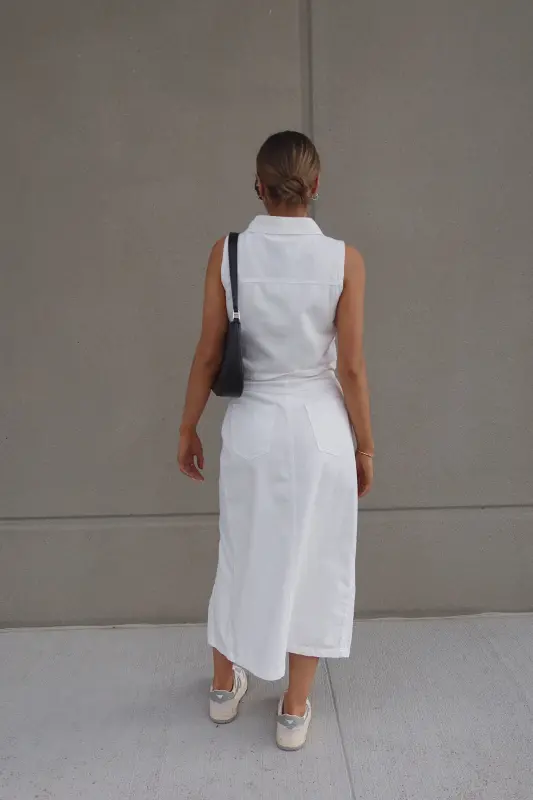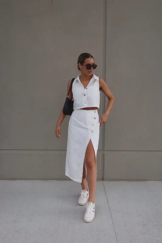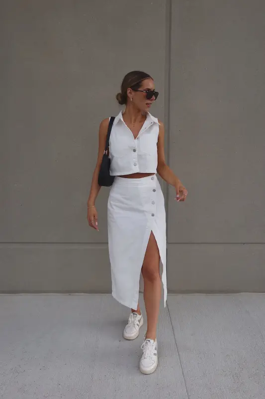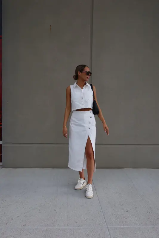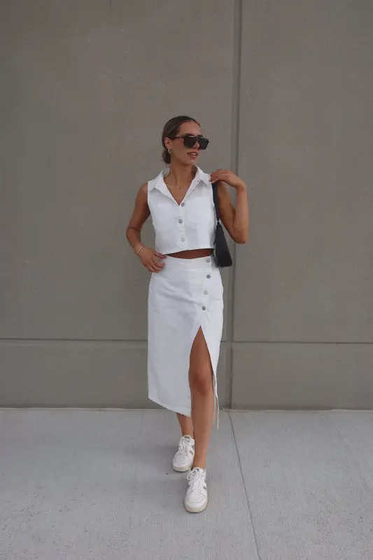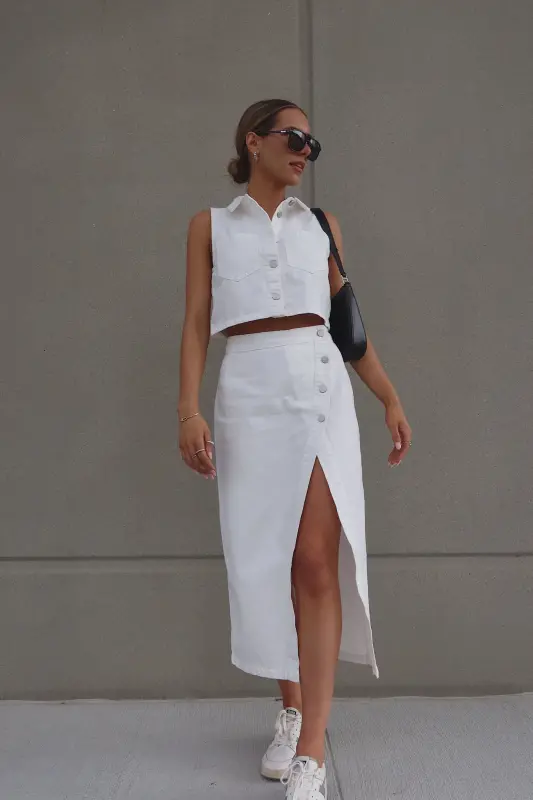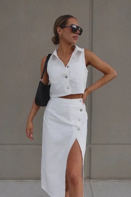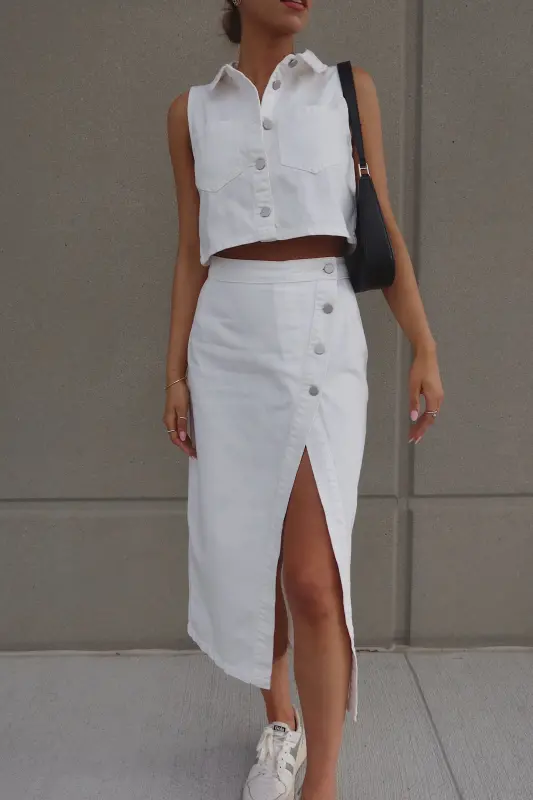 Elevate your wardrobe effortlessly with our White Denim Button Down Top and Skirt Set, a chic ensemble that epitomizes summer style. Featuring a crisp collared neckline and a classic center front button-up design, the cropped top exudes timeless sophistication. Paired with a midi skirt boasting a side button closure and an alluring open front leg slit, this set offers both versatility and elegance. Embrace its one-of-a-kind charm and make a statement this summer with this must-have ensemble that seamlessly combines fashion and comfort.